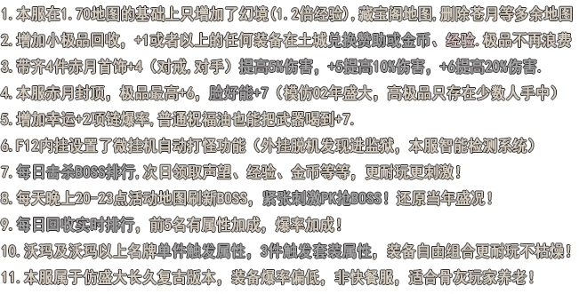 【游戏版本】由1.70版本改编而来,刷怪布局,爆率等均与盛大1.70版本相近,在此基础上加入本服独创新内容.
